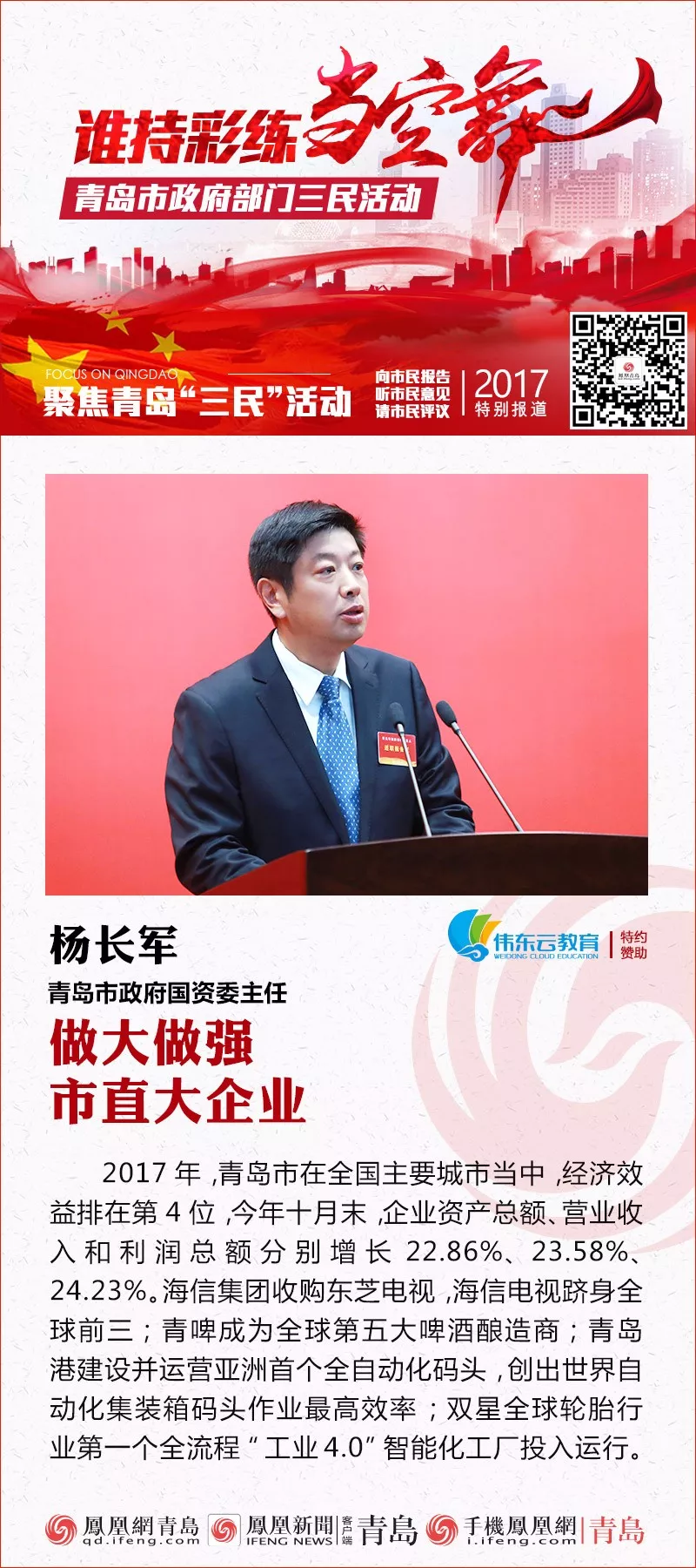 青岛市国资委从任杨长军:市曲大企业经济效益位居全国前列2017年,国资委认实贯彻落实党的十九大,以习新时代中国特色社会从义思惟为,按照市委、市摆设,按照“走正在前列”的要求,攻坚克难,处理问题,营业本能机能方针全面完成,市曲大企业连结了持续健康的成长态势。正在全国次要城市傍边,经济效益排正在第4位,本年十月末,企业资产总额、停业收入和利润总额别离增加22。86%、23。58%、24。23%。
